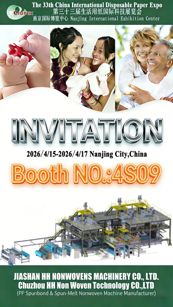 JIASHAN HH Co Innealra Nonwovens, TEO. agus Chuzhou HH Neamh Uigí Teicneolaíocht CO, TEO bródúil as a fhógairt go bhfuil ár rannpháirtíocht sa 33ú Expo Páipéar Indiúscartha Idirnáisiúnta na Síne (CIDPEX 2026) , ar siúl ó 15 go 17 Aibreán, 2026 , ag Ionad Taispeántais Idirnáisiúnta Nanjing, Nanjing City, an tSín.