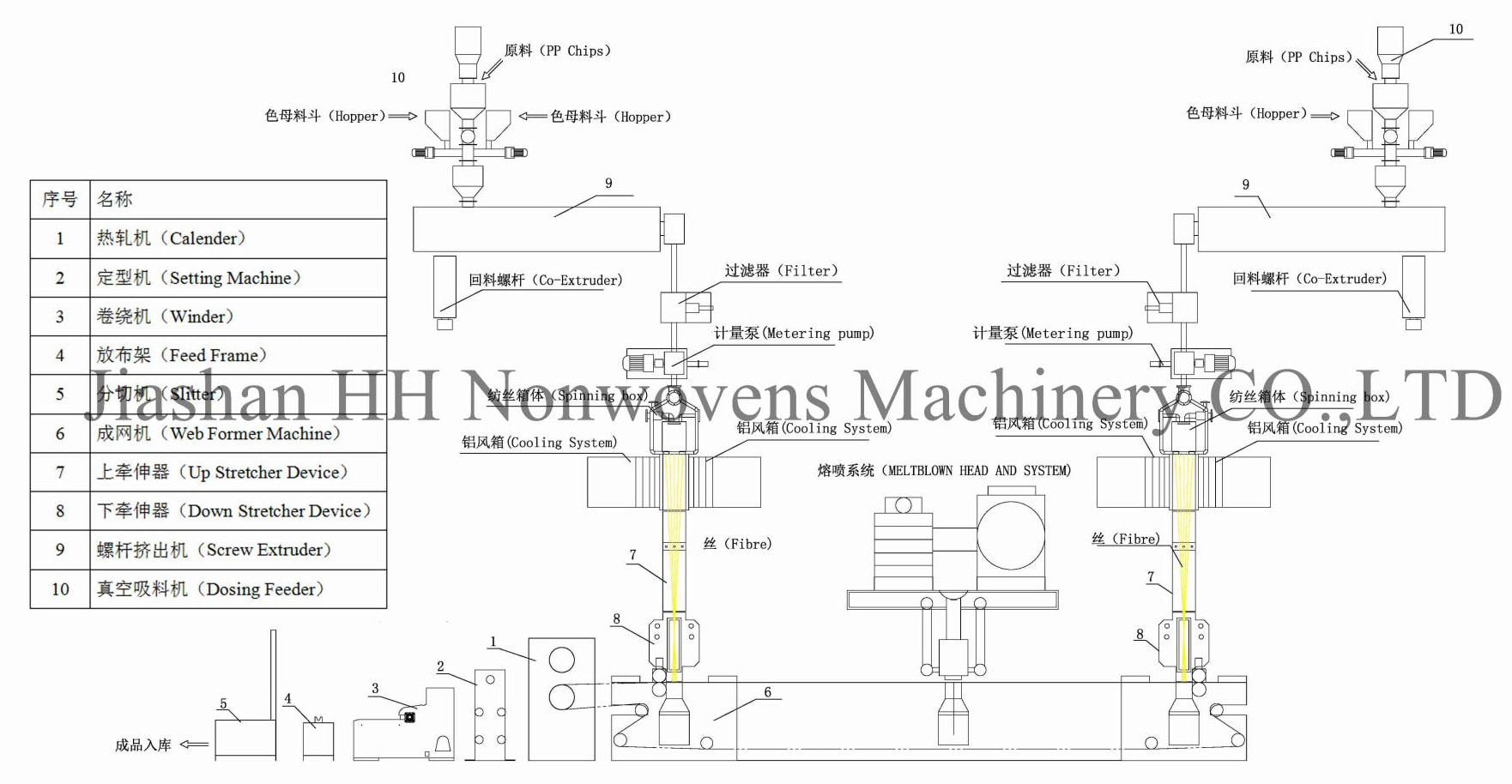 Is é JIASHAN HH Nonwovens Machinery CO., Ltd an tSín Meaisín neamhfhite Trí Bhíoma (SMS) Spun-Melt Déantóirí. Le cáilíocht chobhsaí agus oibriú éasca na líne táirgeachta nonwoven, cuimsíonn ár dtáirge rialta bhíoma aonair, bhíoma dúbailte, SSS, SMS, SMMS, SSMMS agus araile, is é an leithead rialta 1600mm, 2400mm, 3200mm, 4000mm, 4200mm; Táimid tar éis deimhniú bainistíochta córas cáilíochta IS09001 a rith, Tá an líne iomlán uathoibrithe go mór. Tá an líne iomlán dea-struchtúrtha agus éasca le feidhmiú. Tá teicneolaíochtaí déanta, ardfheidhmíochta agus iontaofa ag eilimintí rialaithe. Tá an líne iomlán á rialú ag PLC agus á oibriú le scáileán tadhaill. Is féidir leithdháileadh an phríomhfhráma agus an trealaimh chúnta a dhearadh agus a choigeartú go speisialta de réir riachtanais na gcustaiméirí.